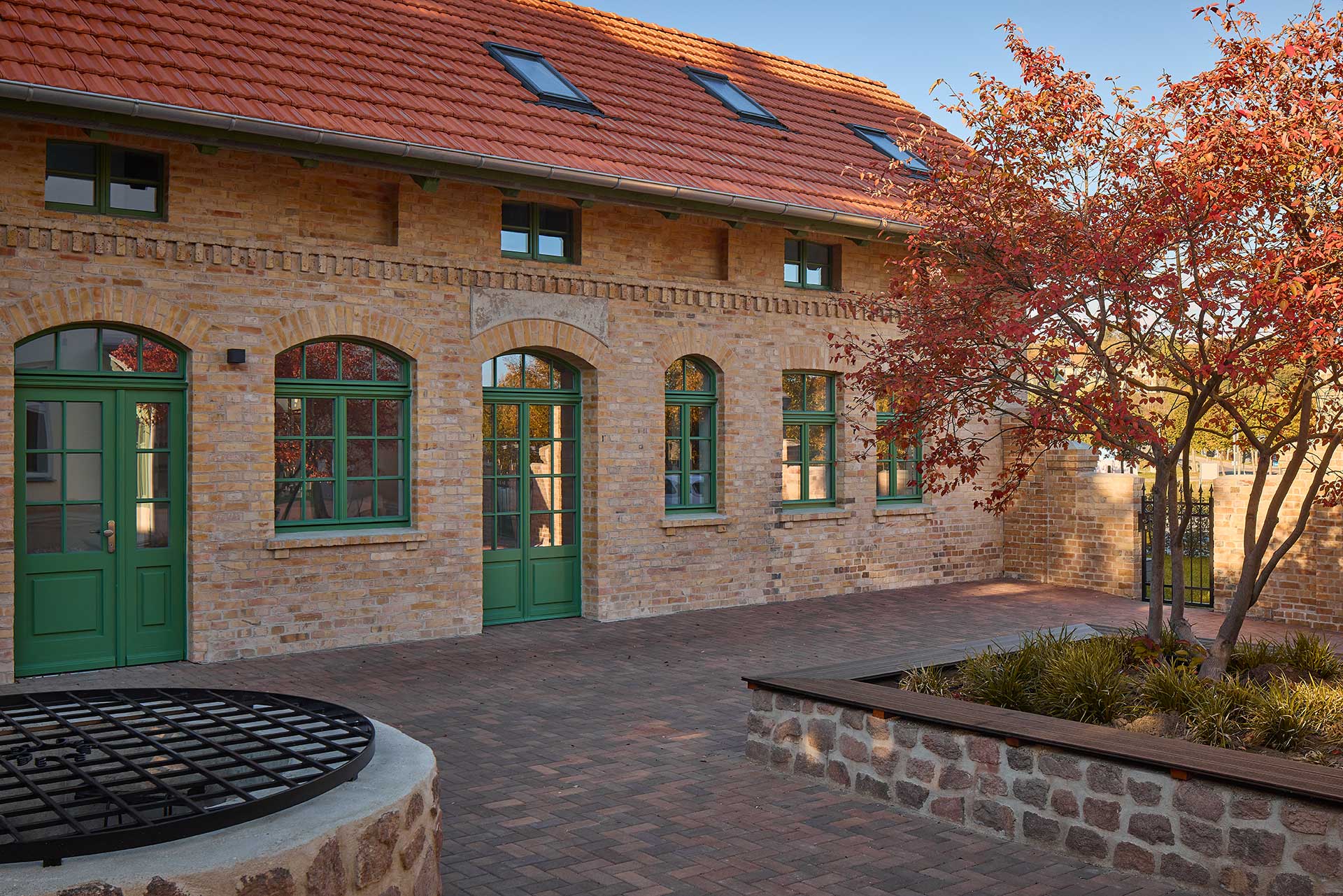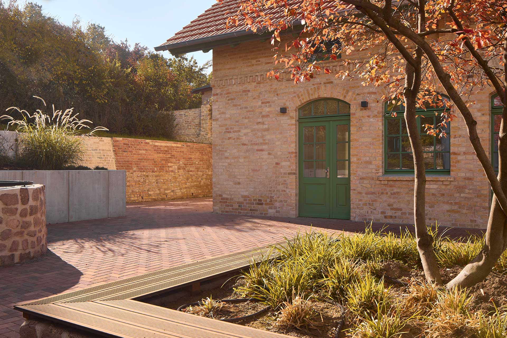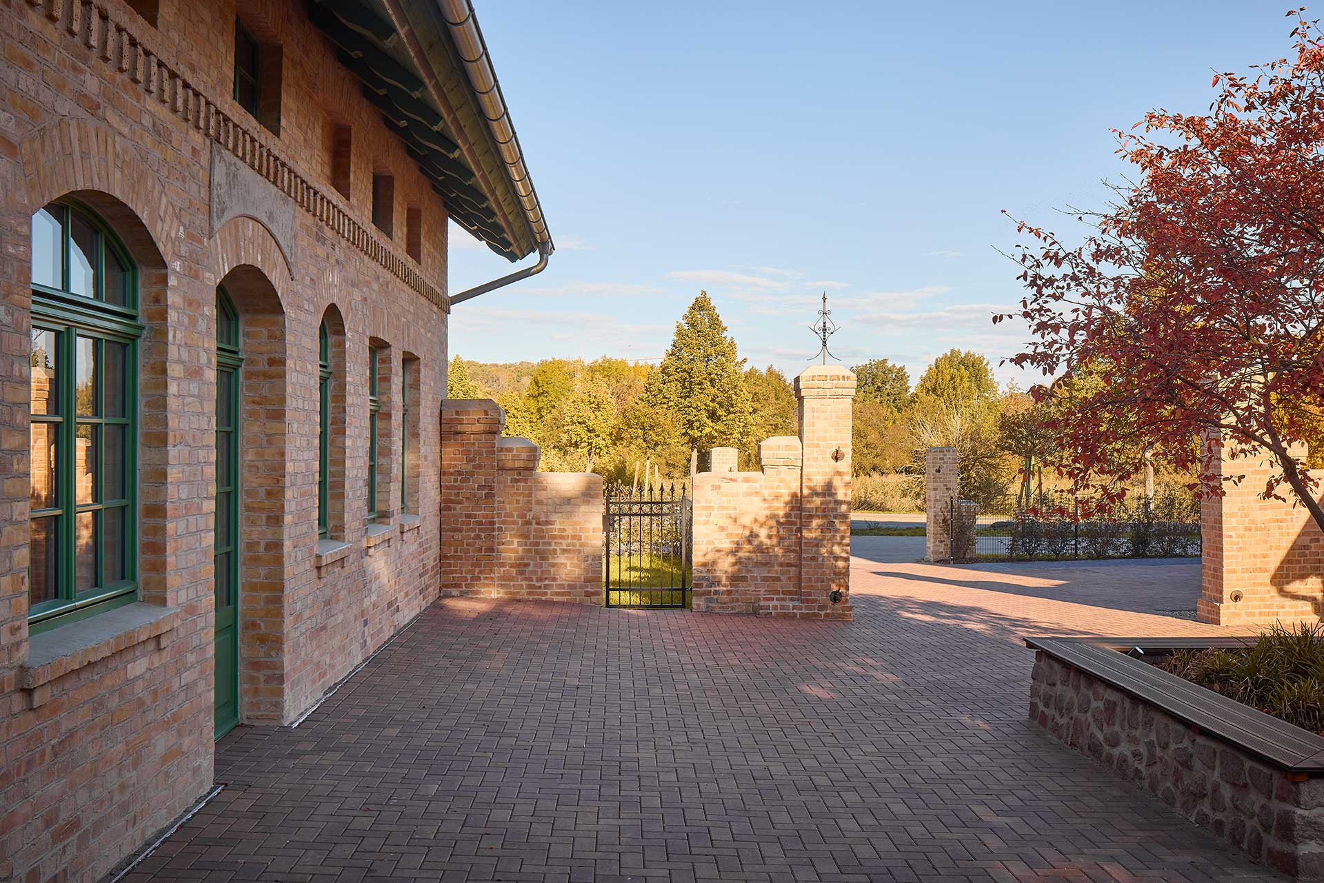 Wiederherstellung des Hofes mit zentralem Brunnen, Eingangsrisaliten und Hofbaum, neue Wegeverbindungen zu beiden Parkplätzen und Schaffung von acht PKW Stellplätzen