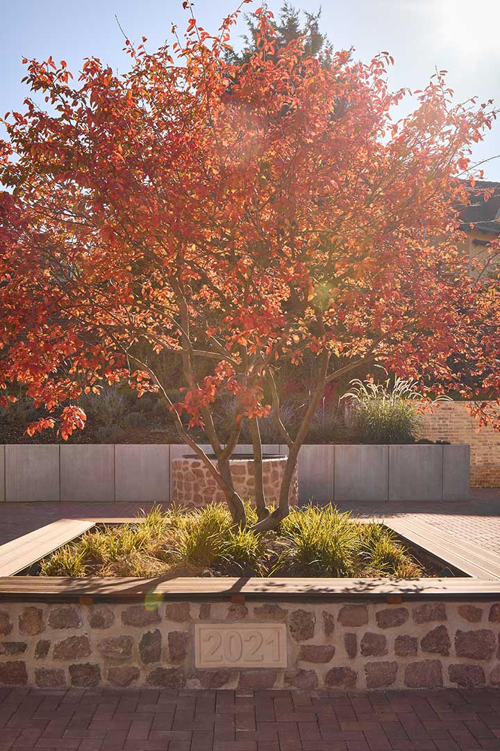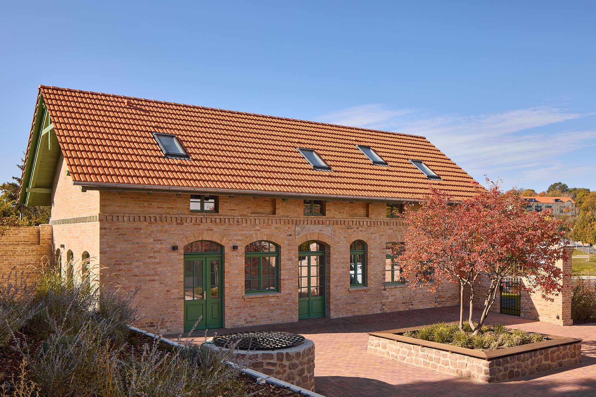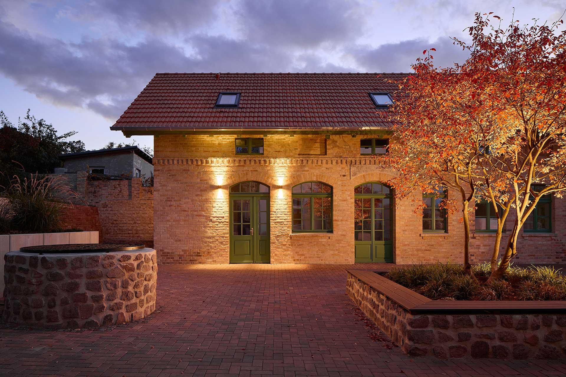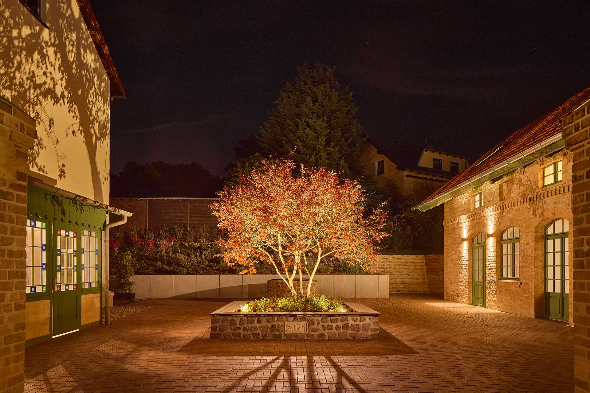 Wiederherstellung des Hofes mit zentralem Brunnen, Eingangsrisaliten und Hofbaum, neue Wegeverbindungen zu beiden Parkplätzen und Schaffung von acht PKW Stellplätzen
