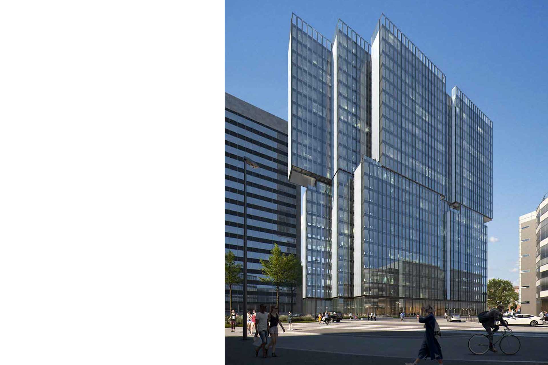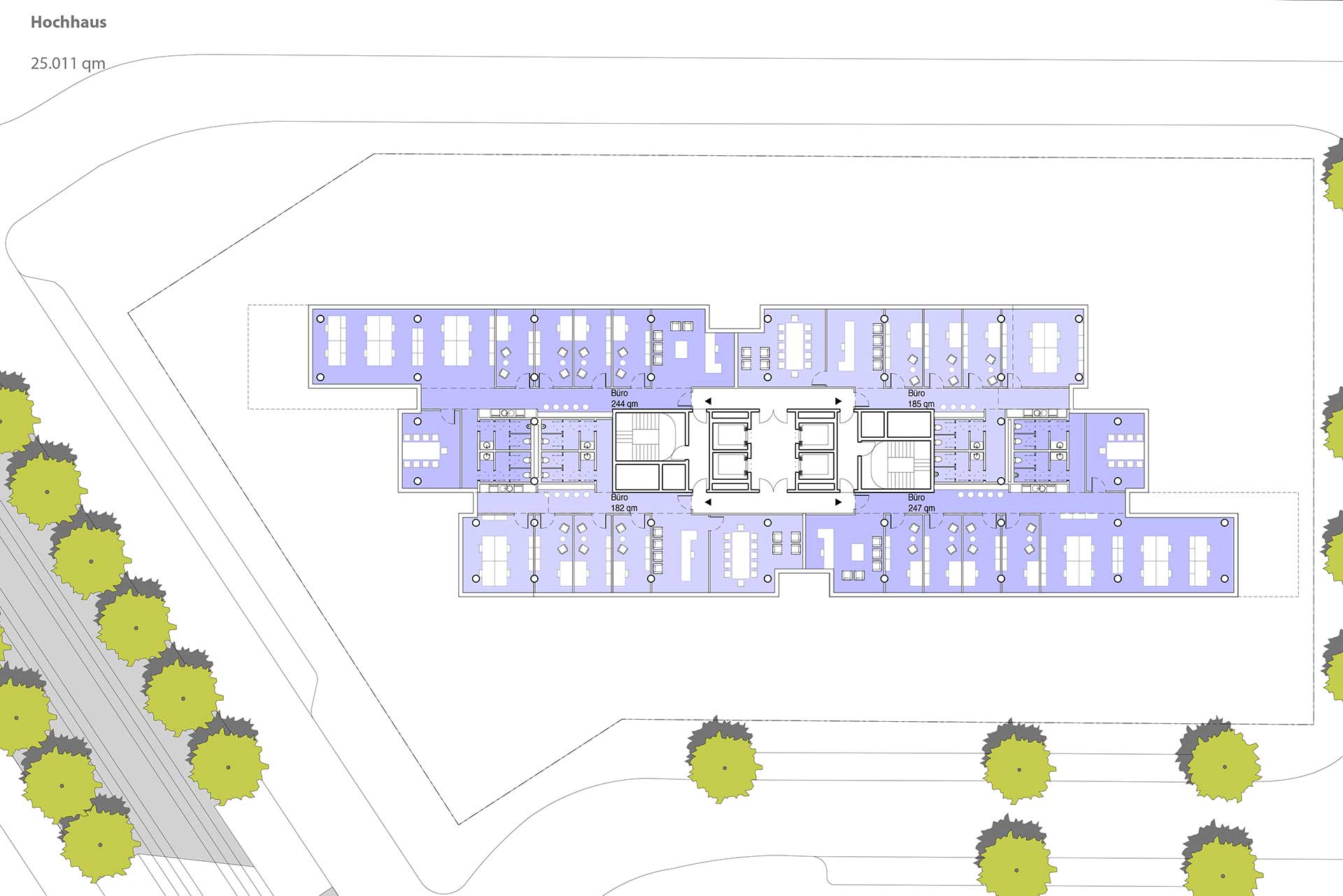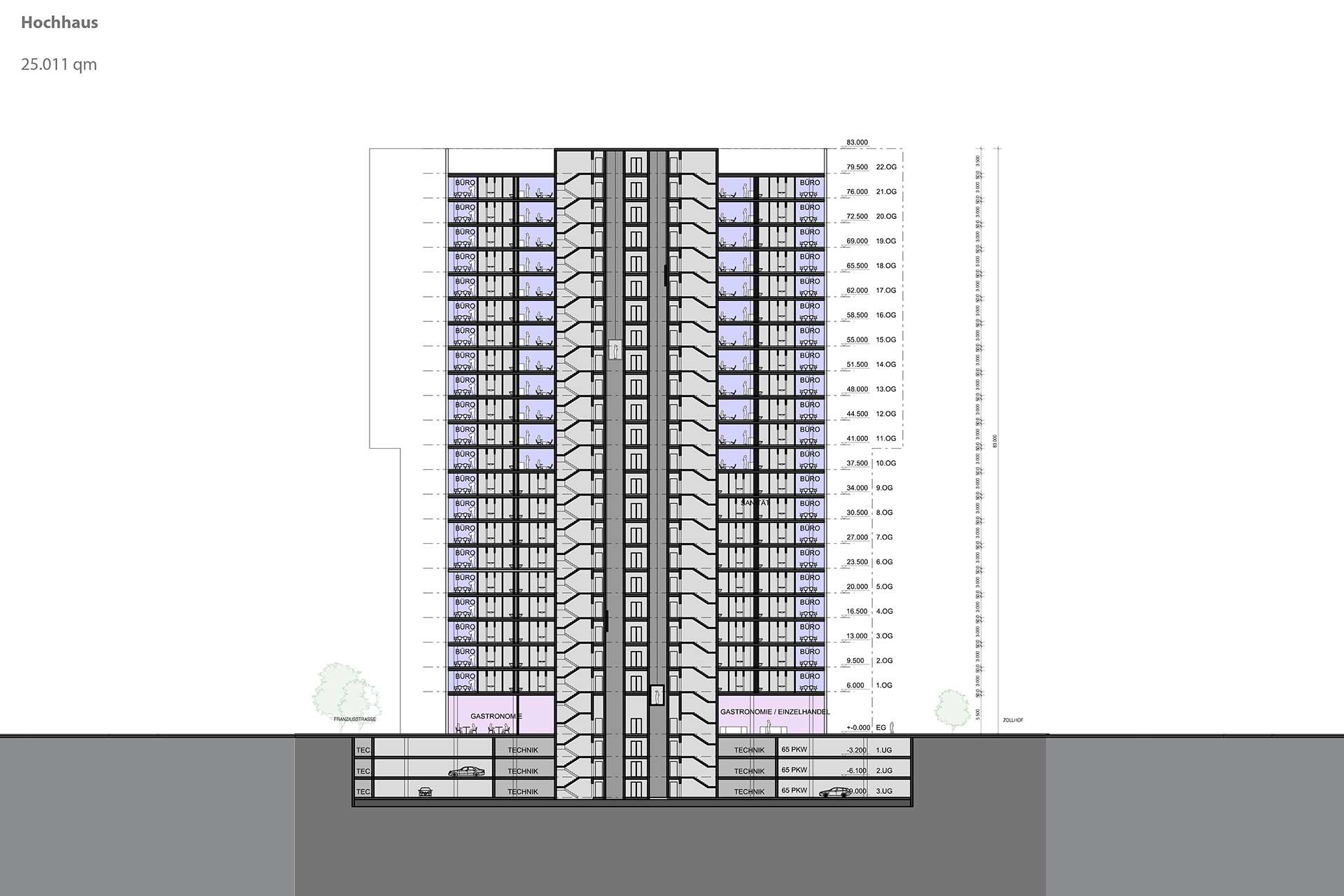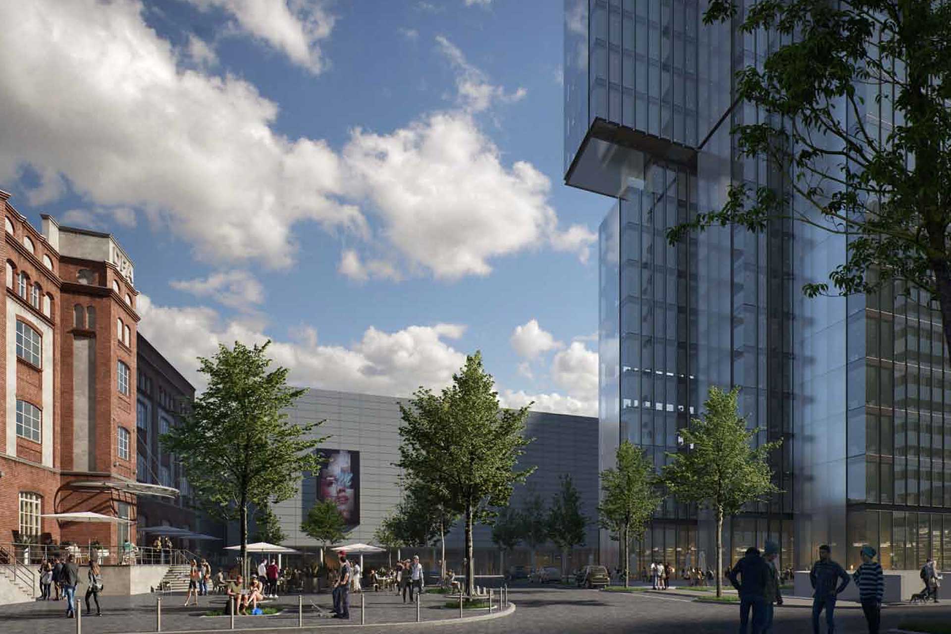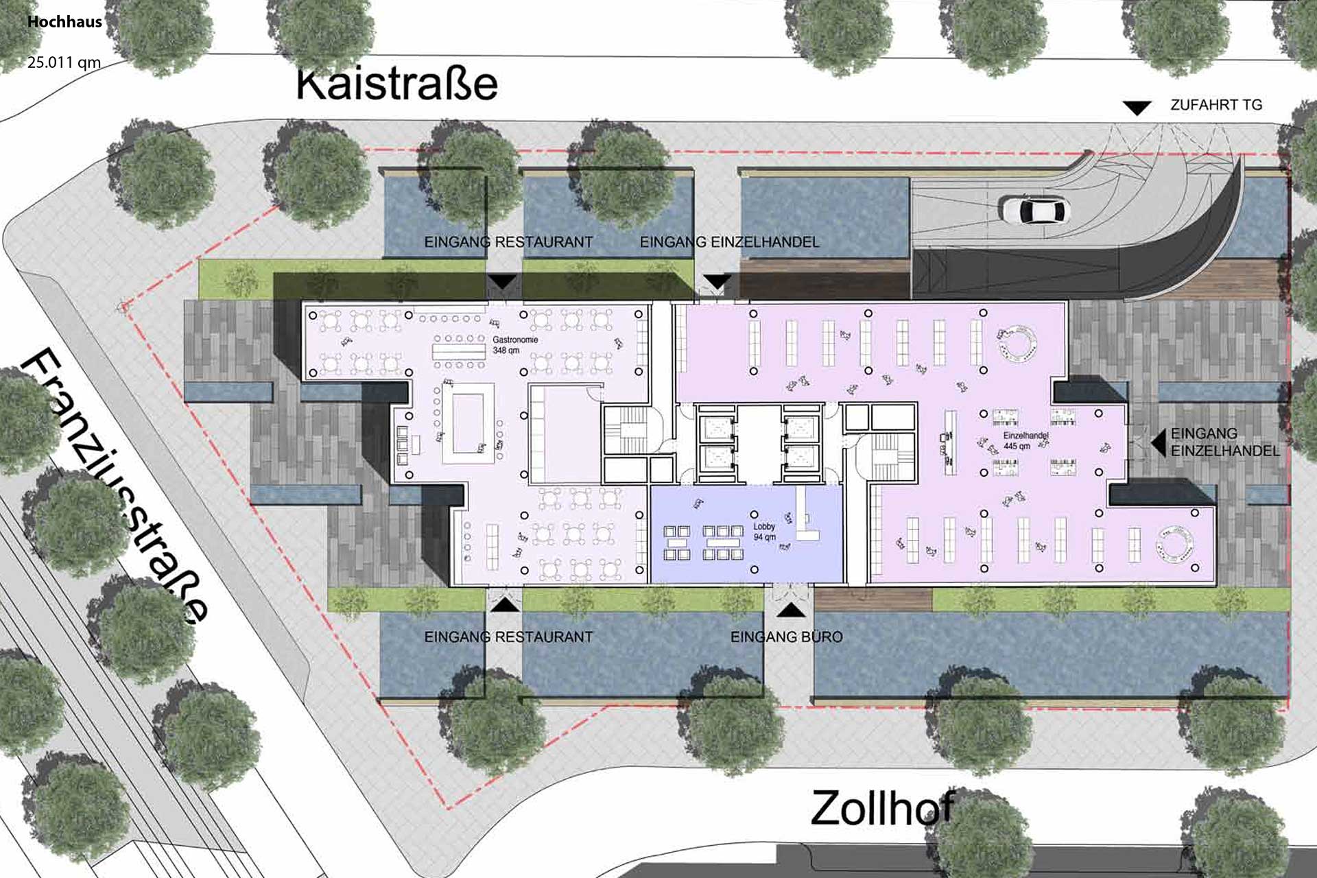 Die Abstaffelung schafft im Osten großzügige halböffentliche Freiflächen und Außenraumbezüge (z.B. für Gastronomie) und macht den Platz vor dem DFA-Haus zusammen mit der hochwertigen Landschaftsgestaltung in der Kaistrasse 1 zu einem kleinen Quartiersplatz.