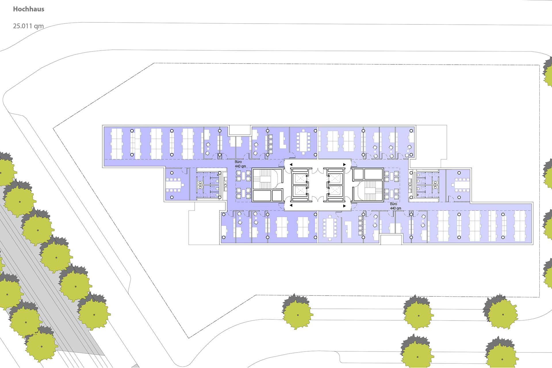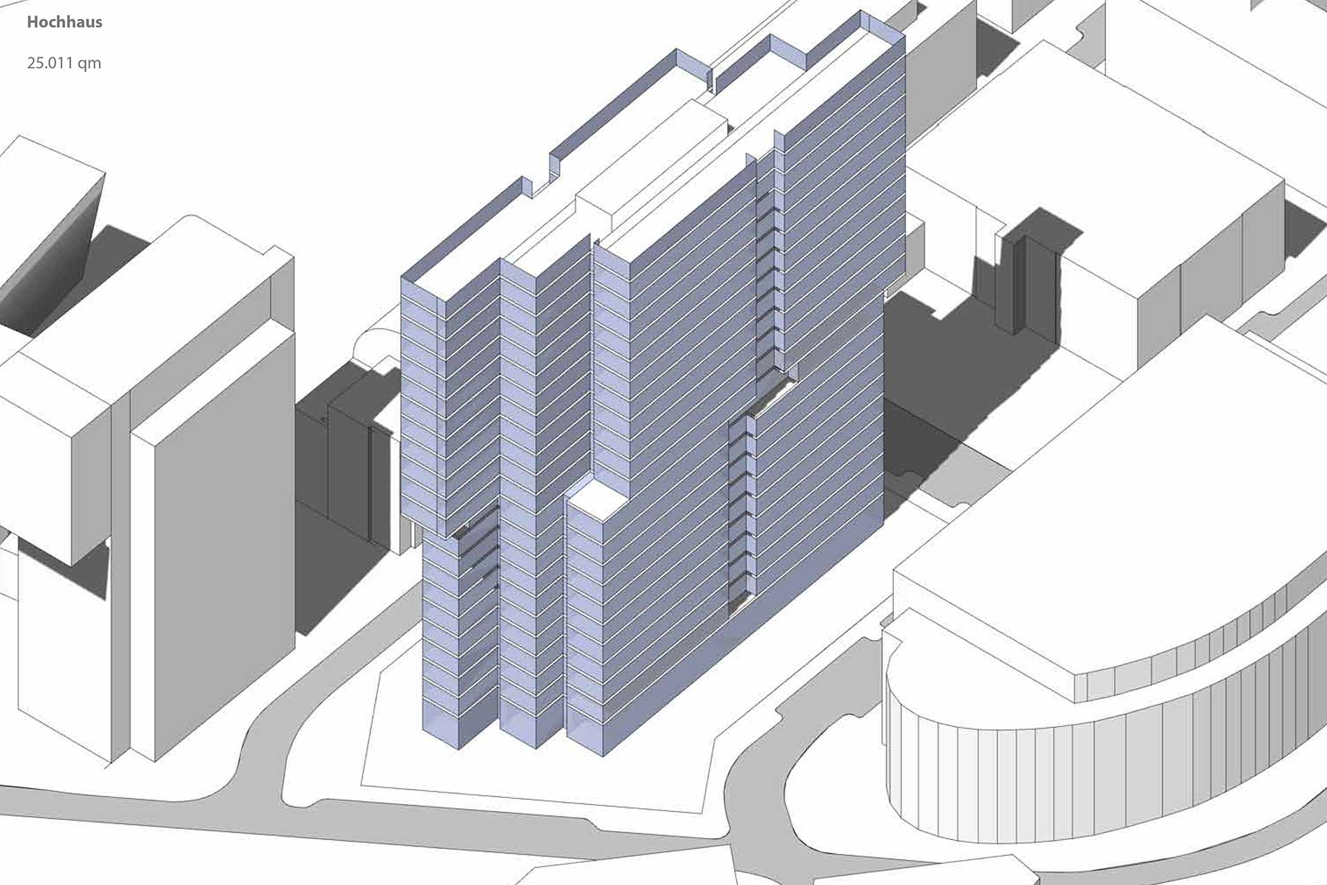 Auch im Westen aktiviert der Gebäudekörper durch seine Abstaffelung den öffentlichen Raum. Halböffentliche Flächen, z.B. Terrassenbereiche von Gastronomie schaffen ein Gegenüber zur “Piazza“ des Floatensembles und werten es somit weiter auf.