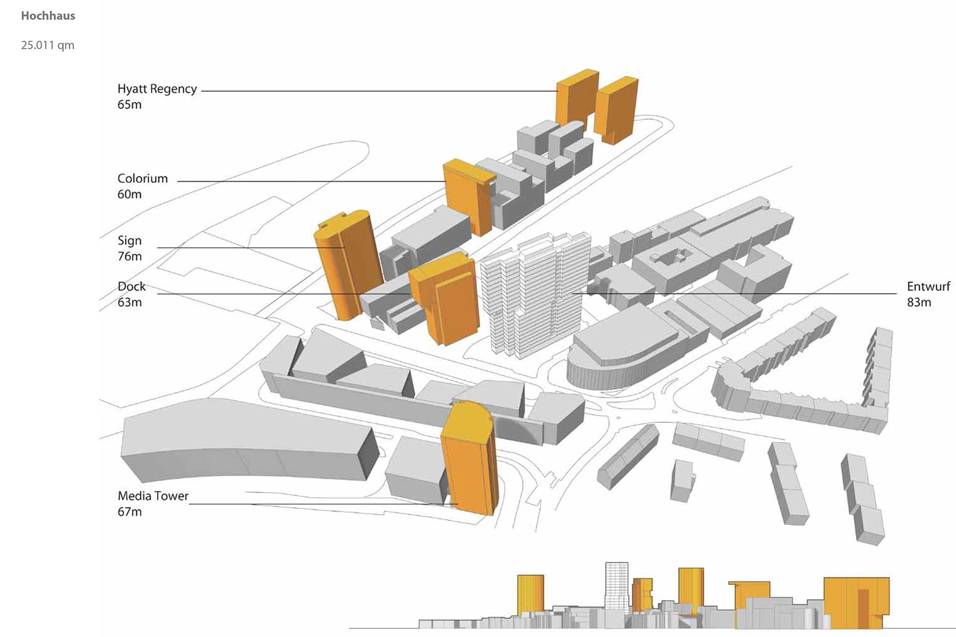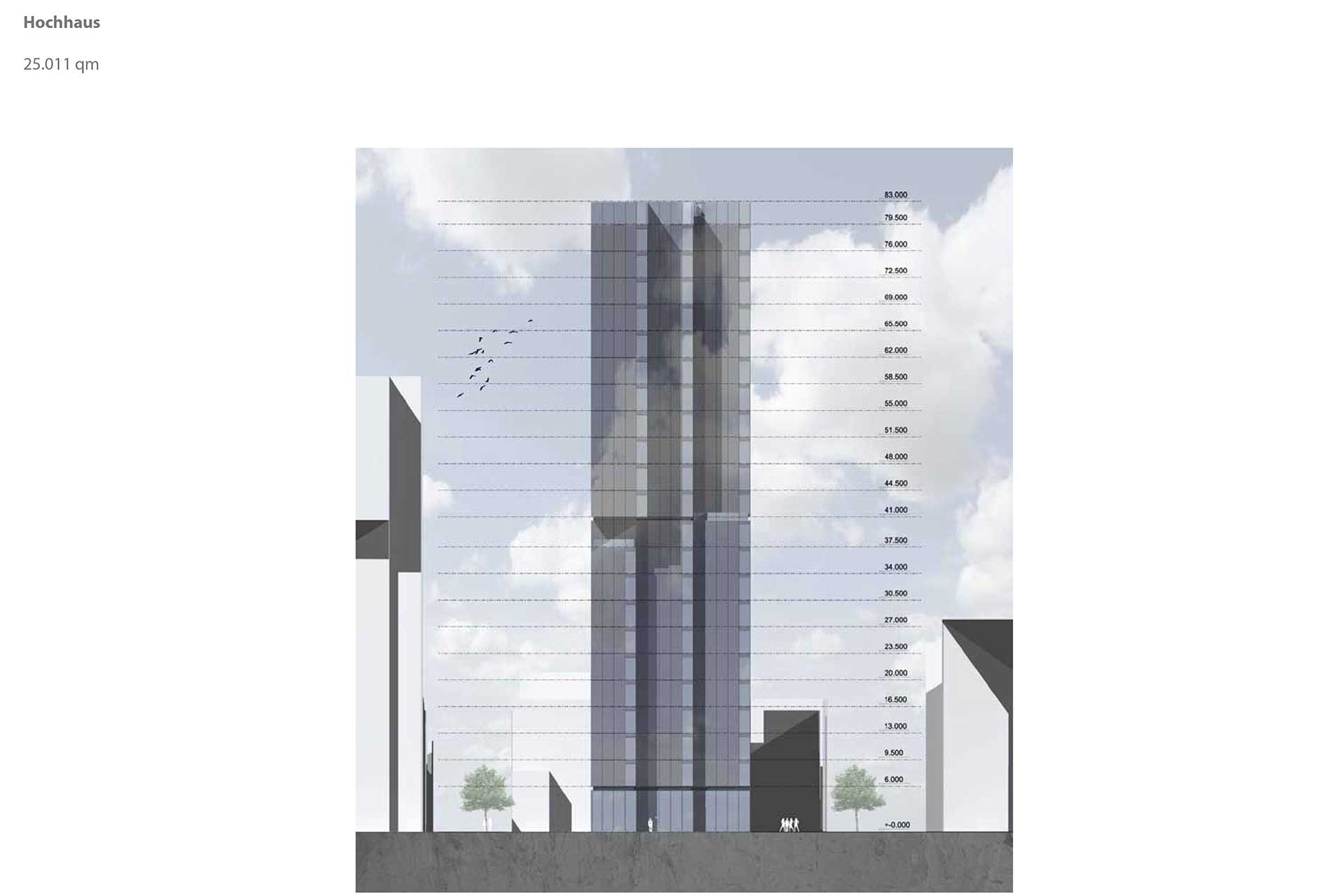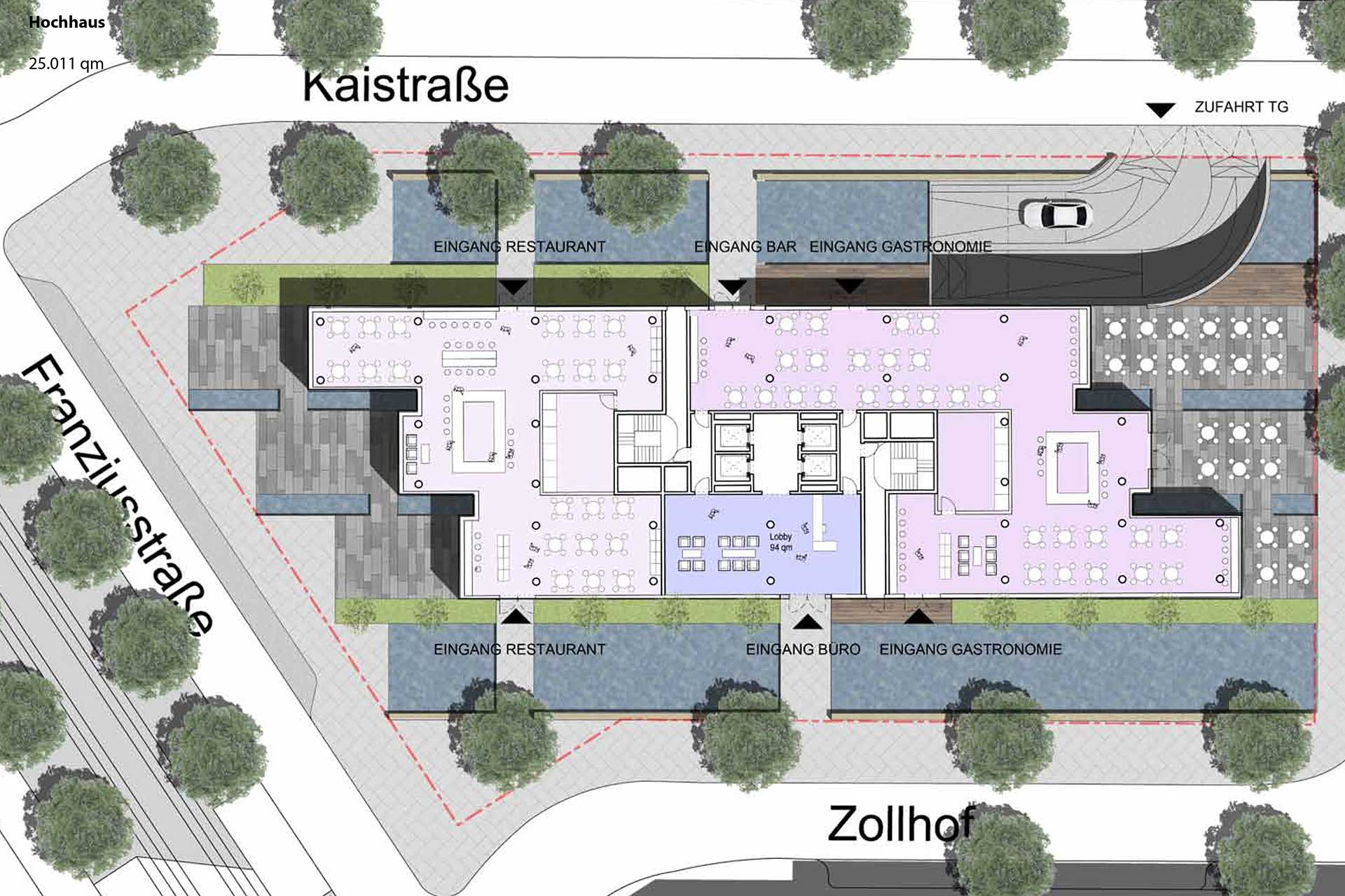 Der schmale Gebäudekörper mit der in Richtung Westen und Osten abgestaffelten Kubatur weitet den Straßenraum und wahrnehmbaren öffentlichem Raum in der Kaistrasse und am Zollhof deutlich auf und lässt somit stadträumliche Sichtbezüge zu, die wiederum eine Platzfolge schaffen, von der “Piazza“ des Floatensembles zu dem Platz vor dem Speichergebäude von 1899.