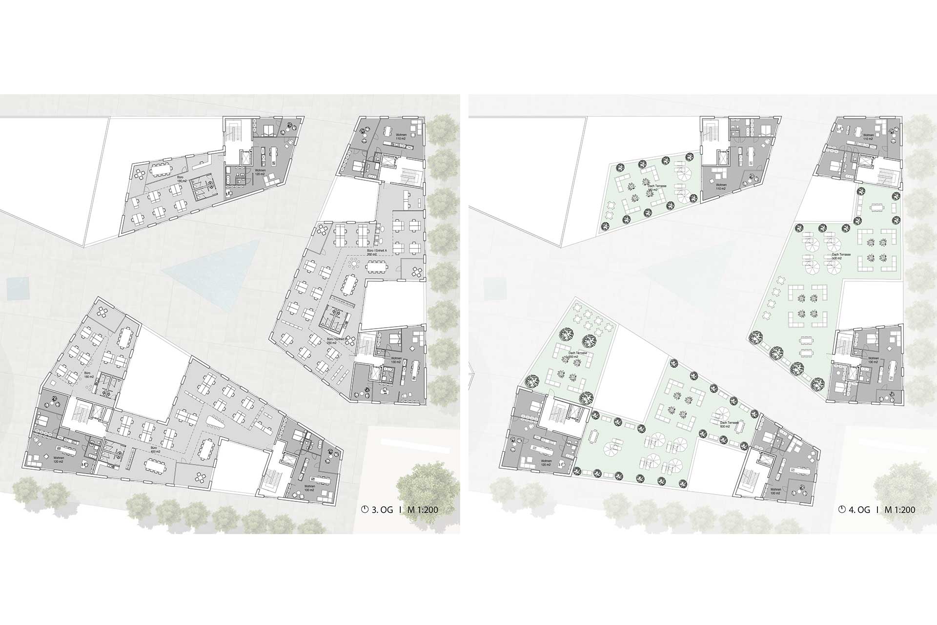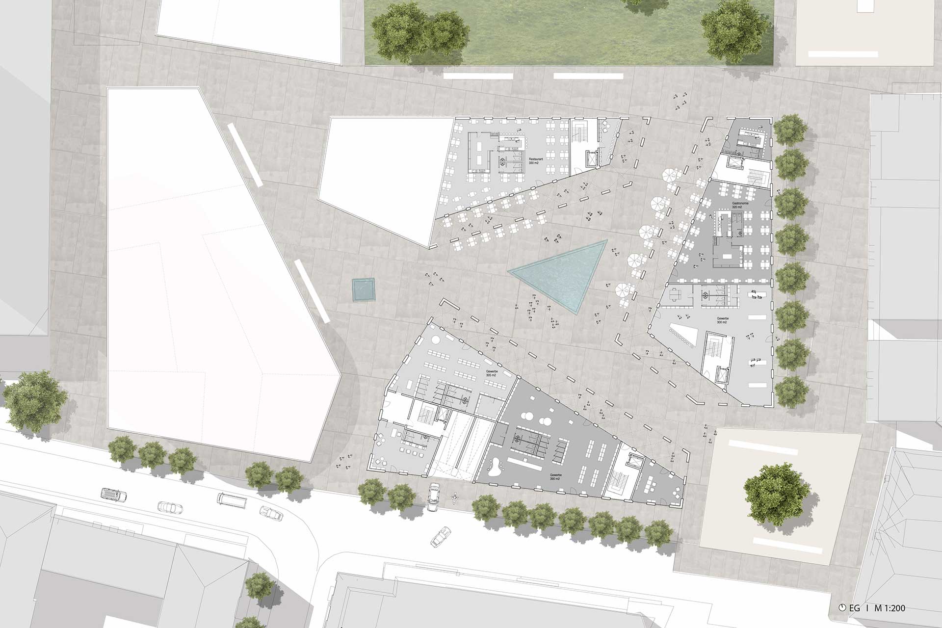 Der hier vorgestellte Entwurf möchte diese Gelegenheit wahrnehmen und ein Gesamtensemble vorschlagen, welches sich an historischen Bezügen orientiert, diese aber zeitgenössisch neuinterpretiert, in hohem Maße identitätsstiftend wirkt und somit zu einem Leuchtturm Projekt für Jena wird. Nachdem die städtebauliche Grundform durch den Rahmenplan vorgegeben ist, schlagen wir ein Konzept vor, welches sich an diesen Rahmen hält, jedoch in seiner Konzeption eigenständig wirkt und ein Gesamtensemble darstellt.
