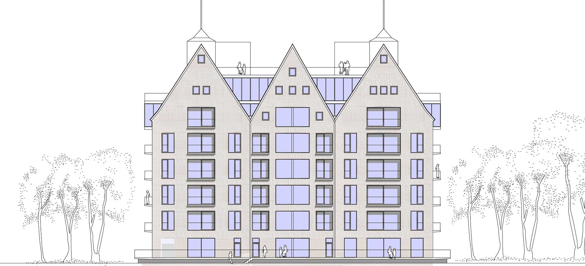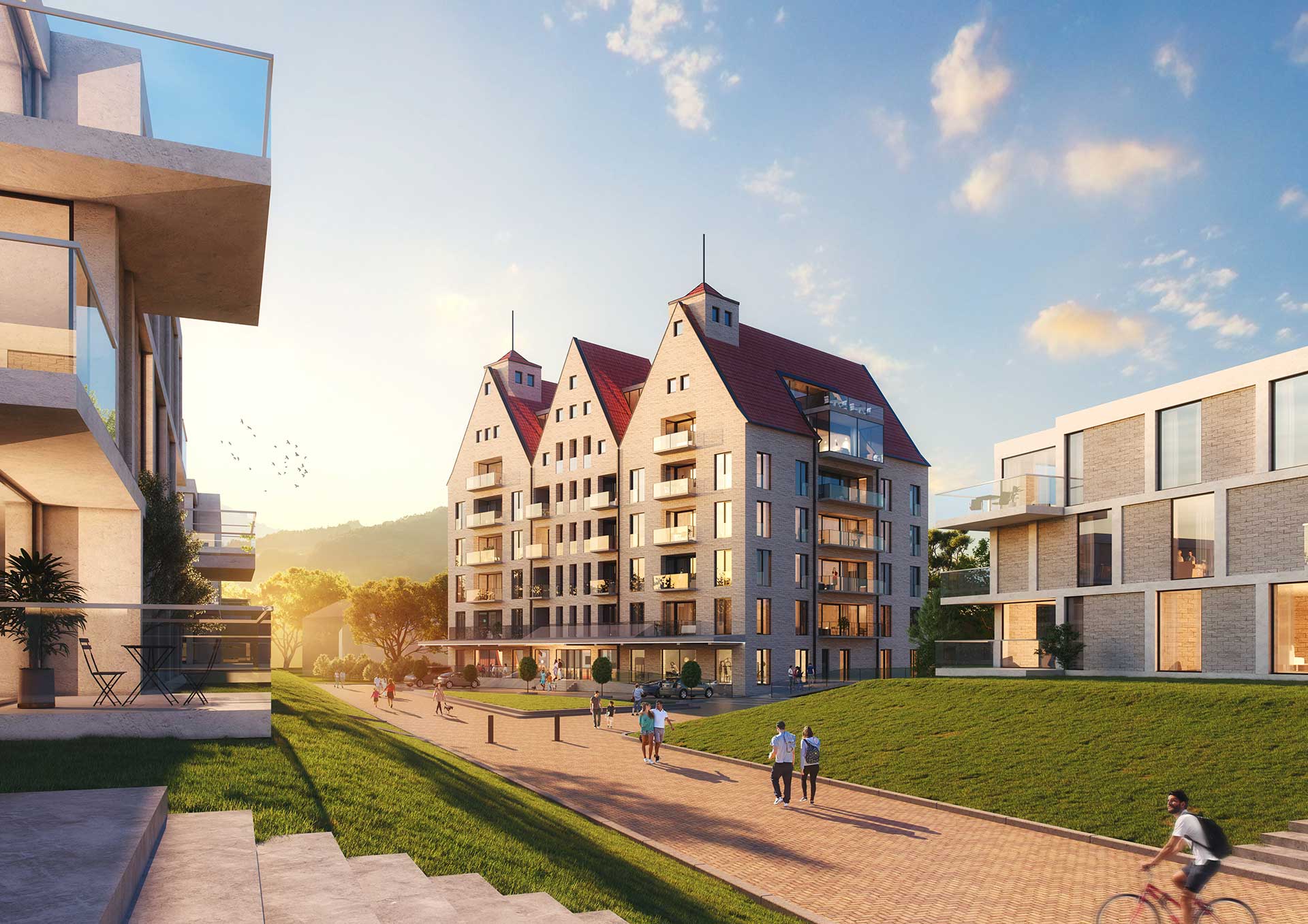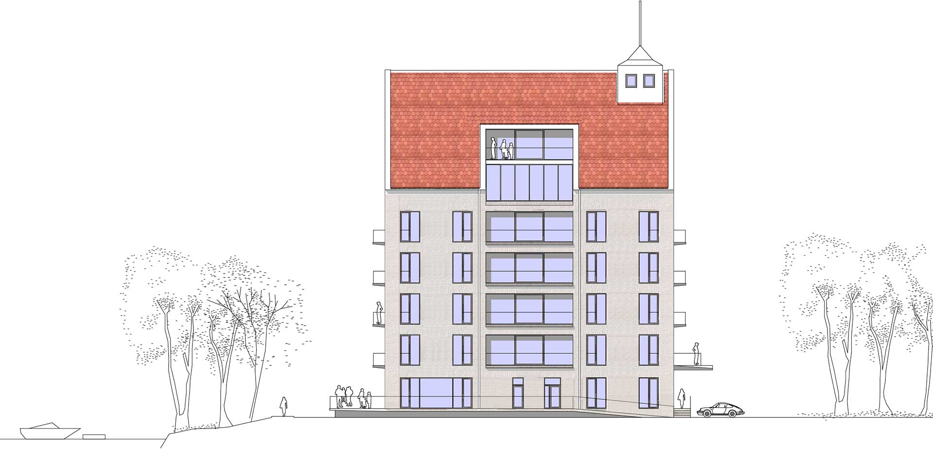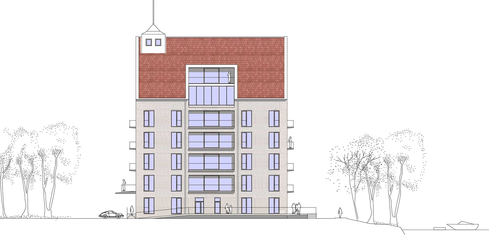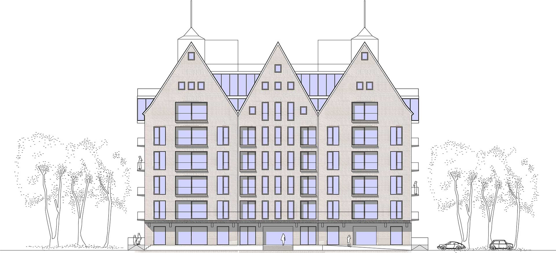 In den charismatischen Giebeln sind Penthouse Wohnungen vorgesehen. Eine Panorama Dachterrasse bietet Mietern und Gästen der Gastronomie zusätzliche attraktive Außenflächen. Für alle Wohneinheiten sind mindestens 1-2 PKW Stellplätze vorgesehen.