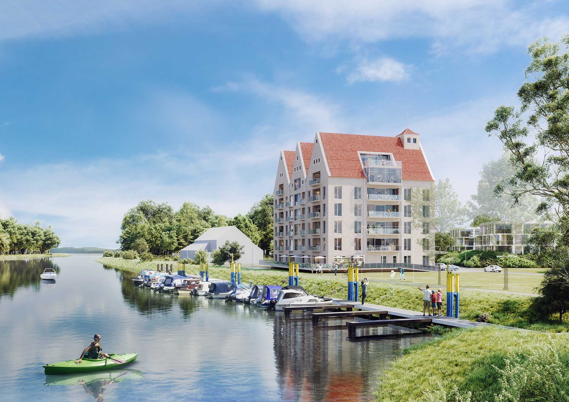 Während im Erdgeschoss der Zugang zu den Wohnungen, eine Gastronomie und Außenterrasse mit direktem Zugang zum Bootssteg, einem Kinderbereich und ein Trainingsraum für die Mieter vorgesehen ist, bieten die vier Regelgeschosse loftartige Wohnungen in verschieden Größen und Typen. Alle Wohnungen verfügen über eine Loggia / Balkon und bieten besondere Blicke über die Saale Niederung und die umgebende Landschaft.